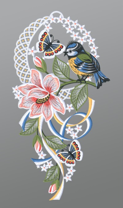 Fensterbild aus Plauener Spitze® - Blaumeise mit Schmetterling und Blume #1W mehrfarbig