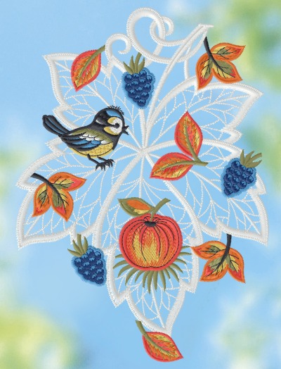 Fensterbild aus Plauener Spitze® - Herbstblatt mit Blaumeise #1W mehrfarbig