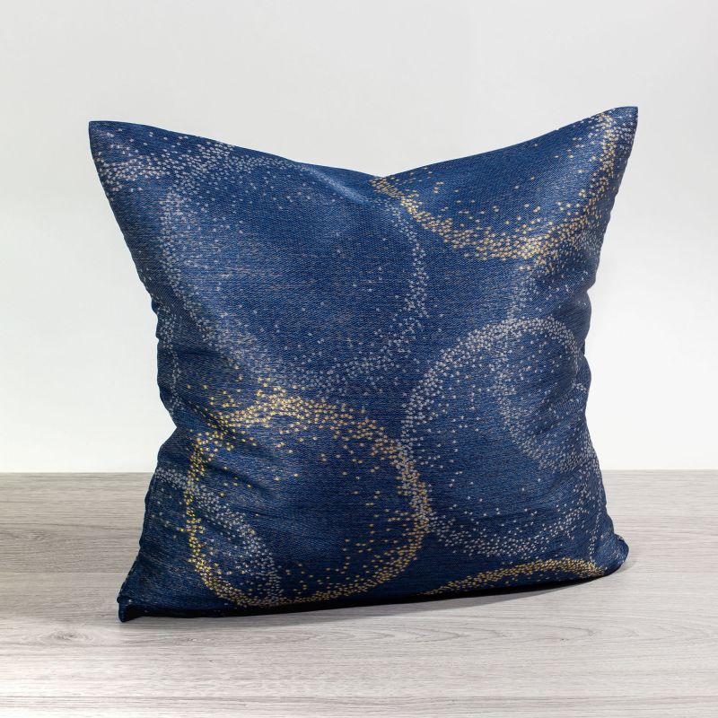 Wie ein Blick in die Sterne öffnet sich dieses Kissen seinen Betrachtern. Auf dem tiefen Blau erscheinen die Kreise intensiv und wirken wie Leuchtfeuer am Nachthimmel. Verbindungen mit Gold unterstreichen den eleganten Ausdruck. Auch graue Kissen sind als Kombination denkbar. Sie zeigen sich stilvoll und rücken das Muster in den Vordergrund.
